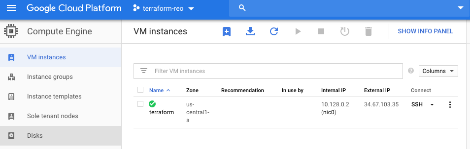 GCP 콘솔에서 Compute Engine > VM instances 메뉴로 이동하여 instance가 정상적으로 생성되었는지 확인한다.