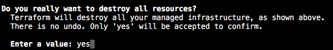 destroy 명령어를 실행하면 apply 명령어 처럼 plan을 보여주고 이대로 진행할것인지 의사를 묻는다.