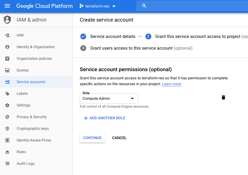 VM instance 하나만 만들어볼꺼니까 Role은 Compute Admin을 선택한다. (Least privilege)